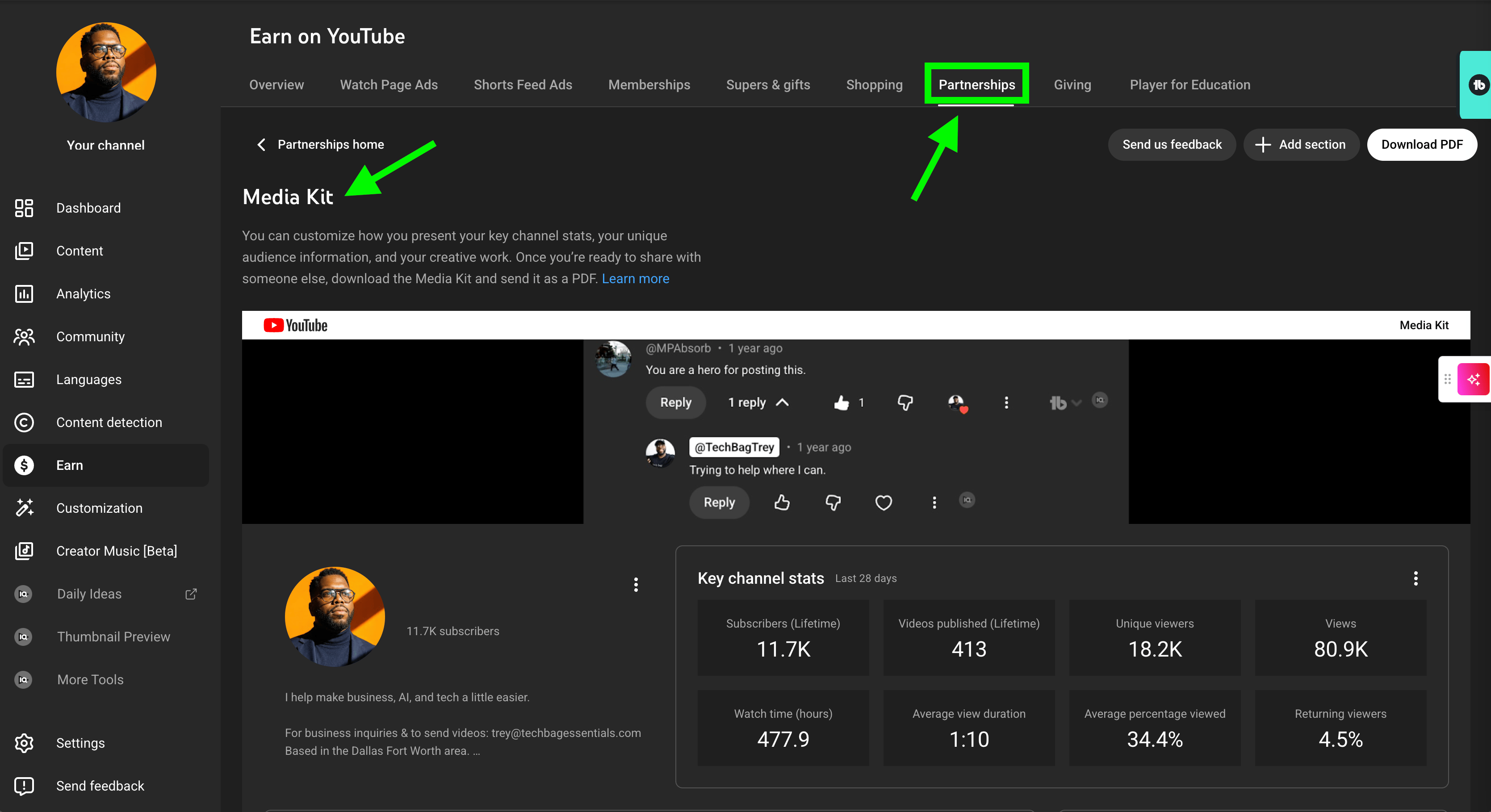 The new Creator Partnerships Hub lives inside YouTube Studio under the Earn tab. Go to Earn, then Partnerships, and you will find something that did not exist before: YouTube builds your media kit for you. Real-time audience data, automatically packaged. No manual updates, no outdated PDFs. It pulls your current stats and presents them to brands shopping for creators inside what amounts to a Google-powered talent marketplace. YouTube is using Gemini to match your channel with relevant brands on the advertiser side. The 20% talent agent is not going away tomorrow, but the writing is on the wall.